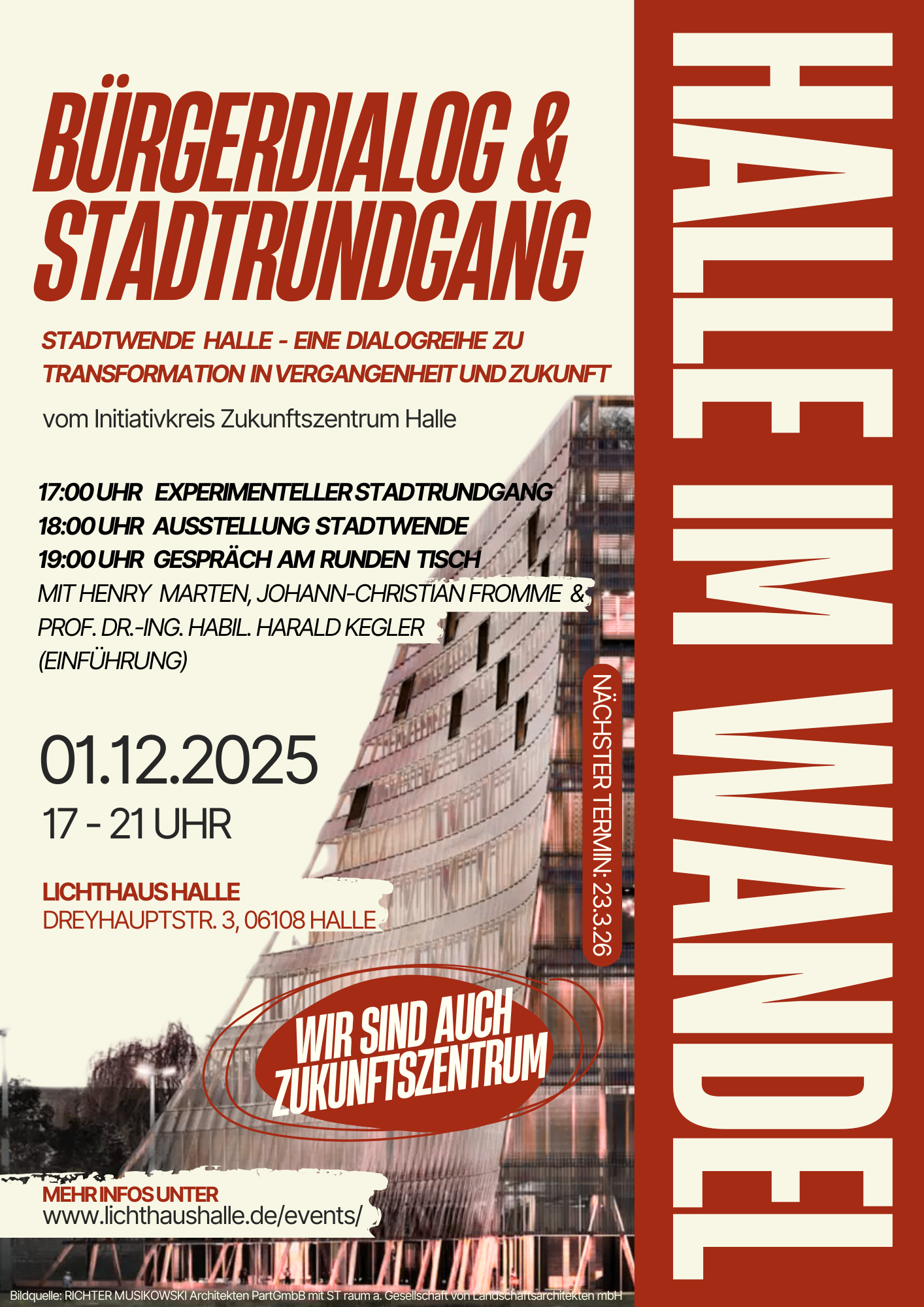Die Veranstaltungsreihe „Stadtwende Halle“ lädt erneut dazu ein, den Wandel der Stadt Halle aus unterschiedlichen Perspektiven zu erleben. Dieses Mal zum Thema „Wir sind das Zukunftszentrum“.