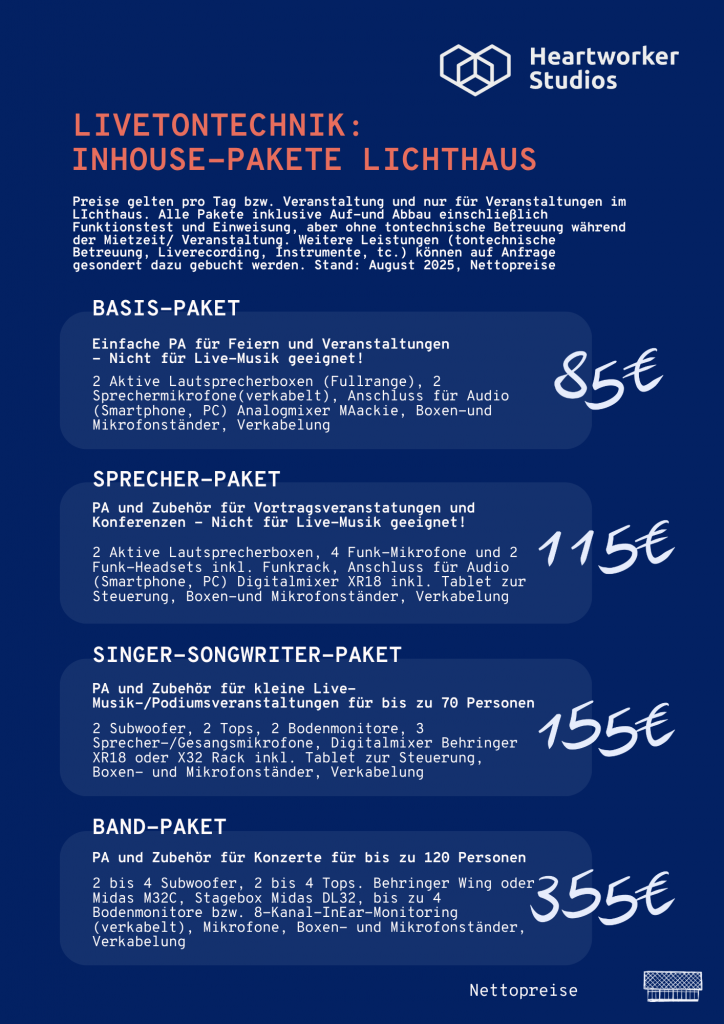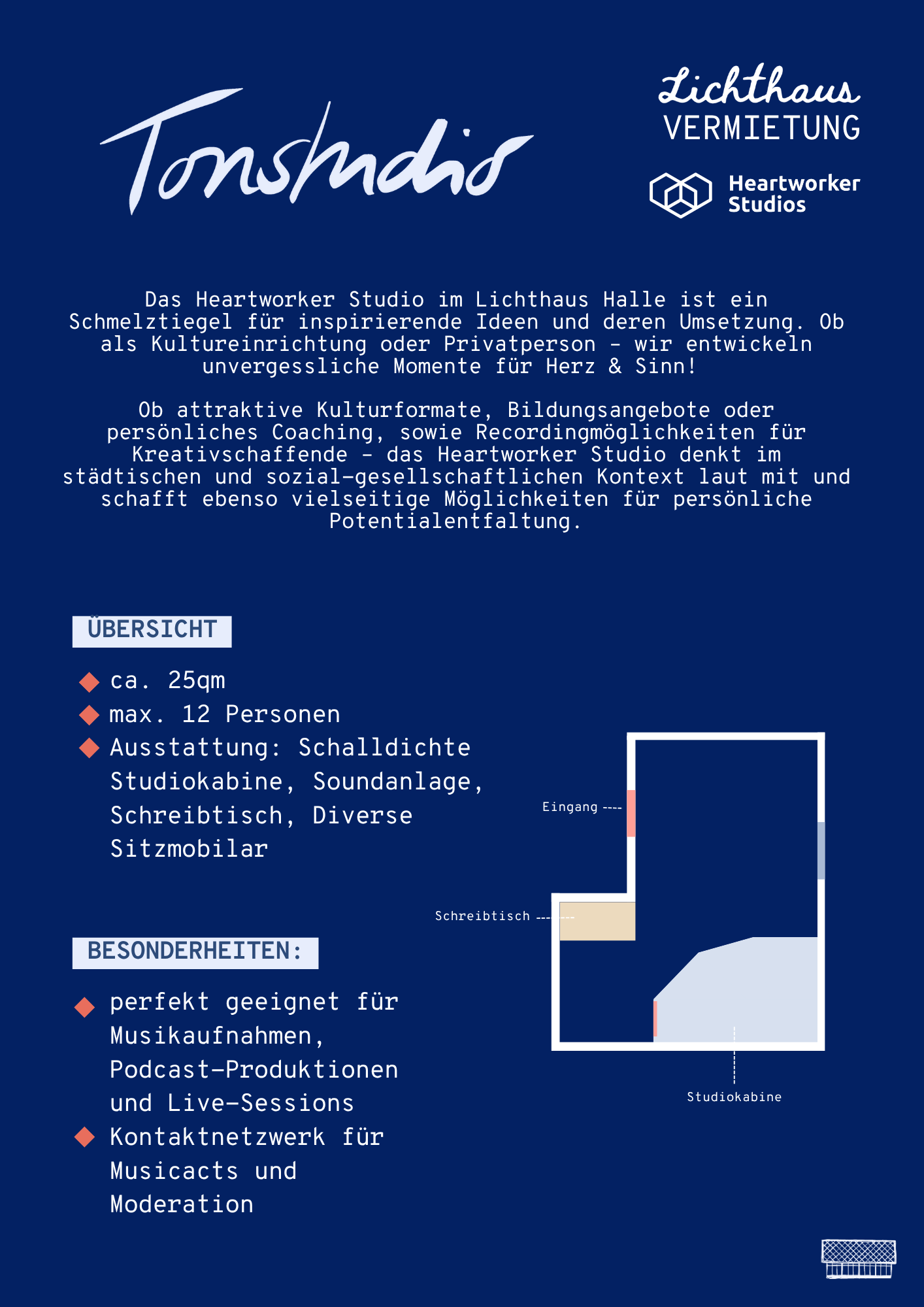 Der akustisch optimierte und ca. 25 m² große Raum befindet sich im Obergeschoss und eignet sich für Tonaufnahmen, Liverecordings, Streaming-Produktionen, Podcasts, Hörspiele, Sounddesign, Videocut & Bildbearbeitung. Weitere Details findest du hier.