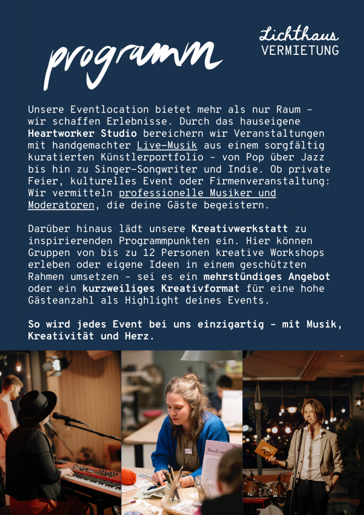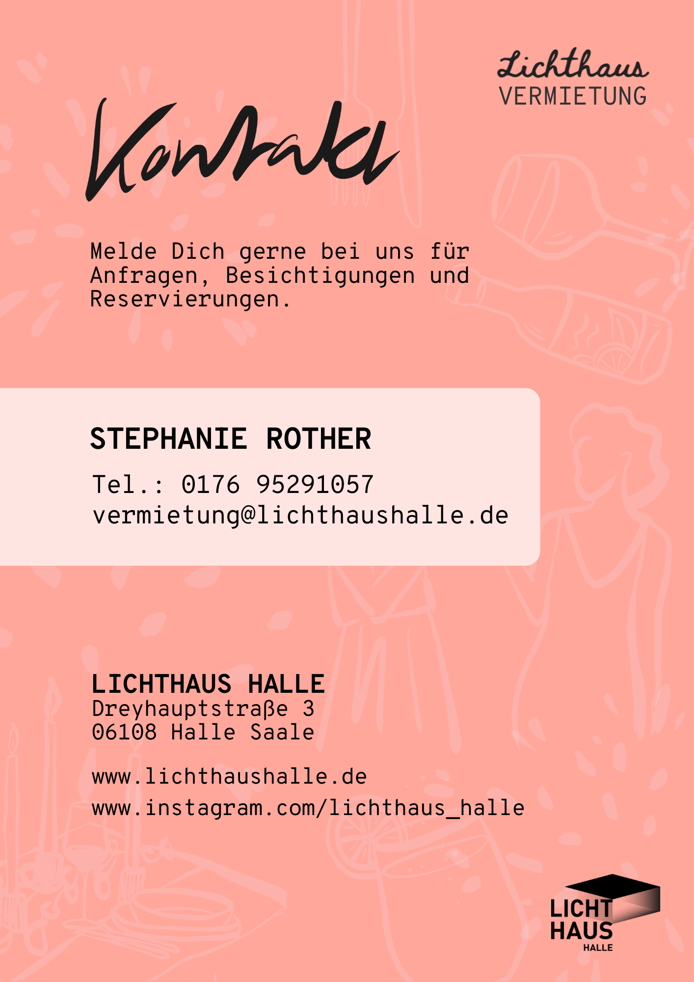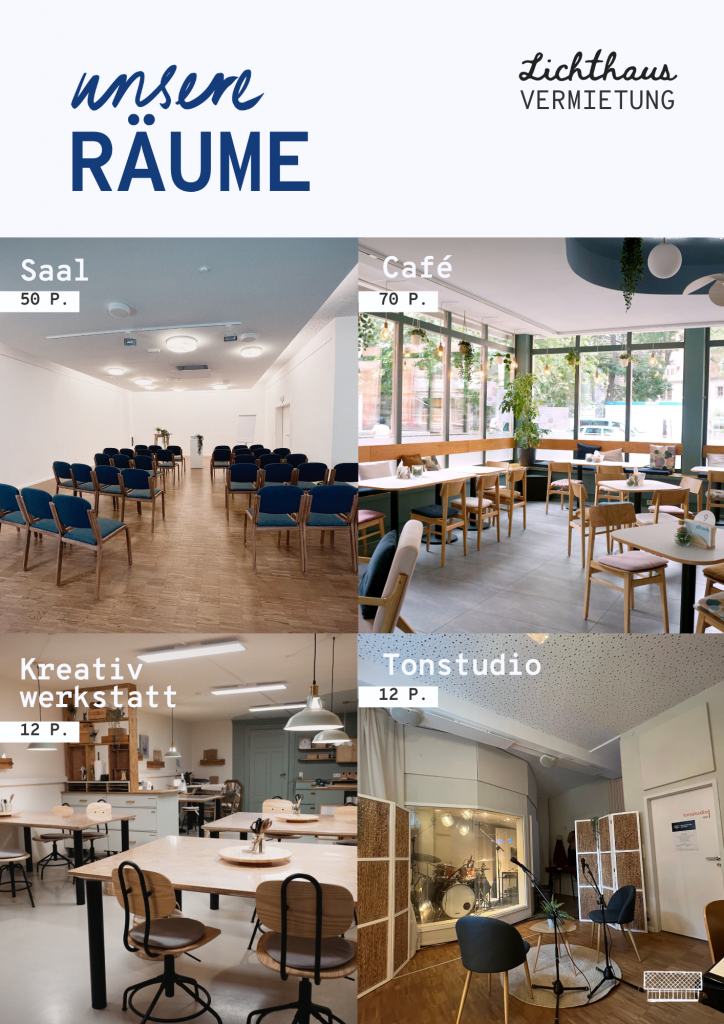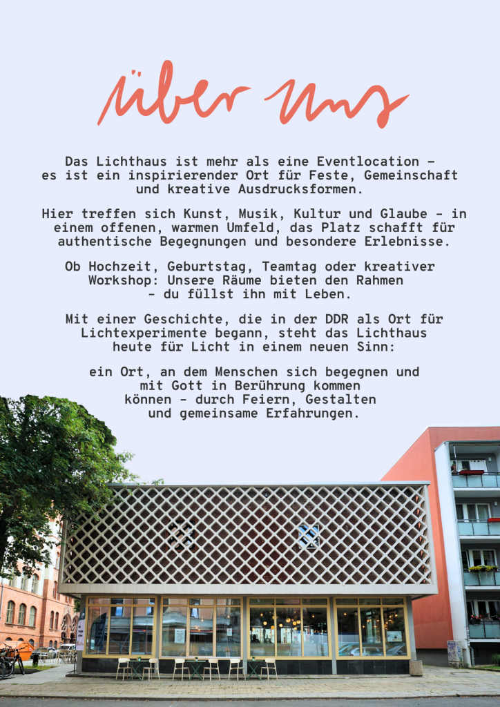 Wir sind ein Ort der Begegnung und möchten Menschen Raum geben, gemeinsam zu sein, zu denken, zu feiern, zu arbeiten und Neues zu schaffen. Dafür öffnen wir dir unsere Räumlichkeiten und unterstützen dich individuell bei der Umsetzung deiner Ideen. Das Lichthaus als Eventlocation ist nicht nur einfach “ein Saal”, wir sind ein Haus für kreative Veranstaltungskonzepte, die alle Kompetenzen des Hauses einbeziehen.