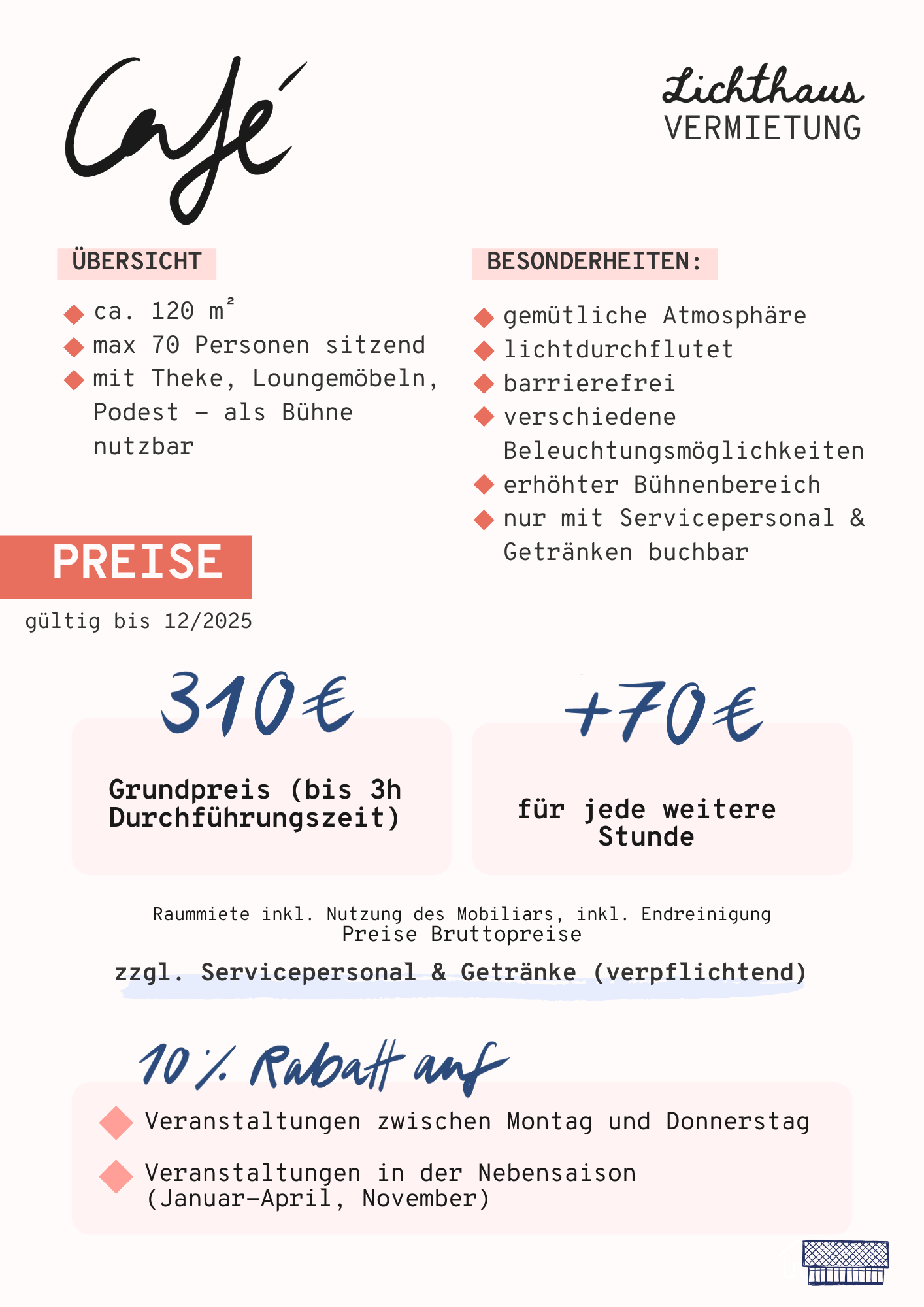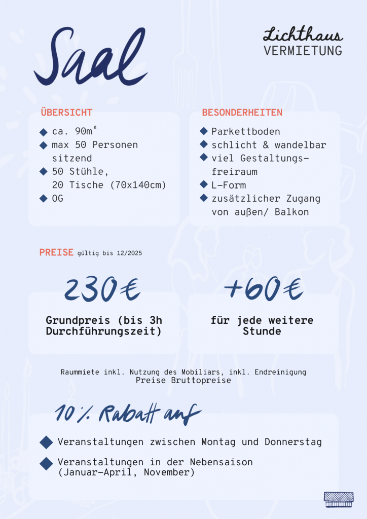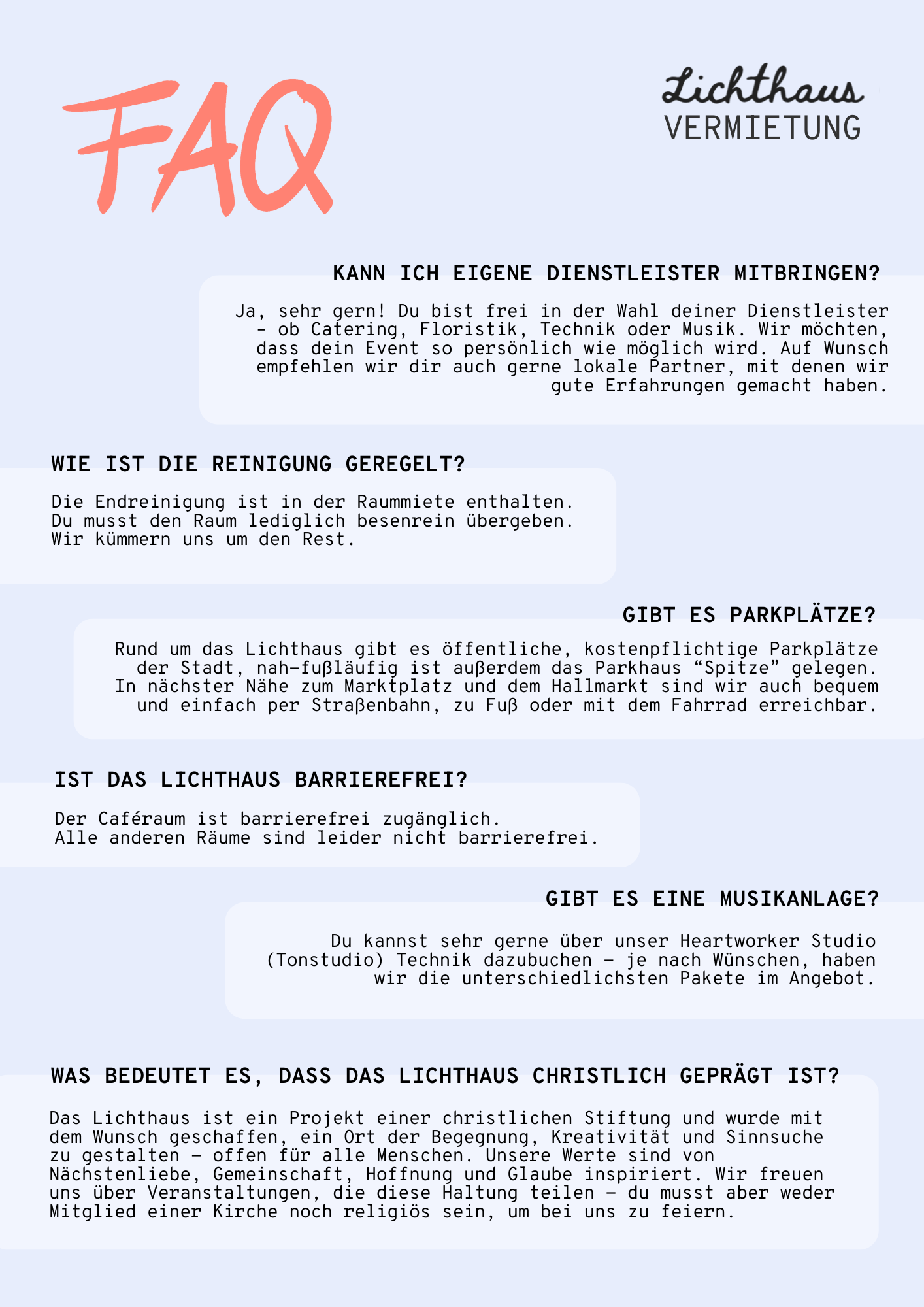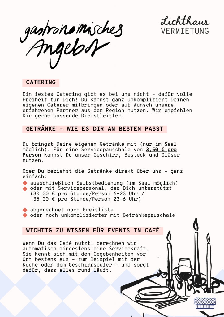 Wir sind ein Ort der Begegnung und möchten Menschen Raum geben, gemeinsam zu sein, zu denken, zu feiern, zu arbeiten und Neues zu schaffen. Dafür öffnen wir dir unsere Räumlichkeiten und unterstützen dich individuell bei der Umsetzung deiner Ideen. Das Lichthaus als Eventlocation ist nicht nur einfach “ein Saal”, wir sind ein Haus für kreative Veranstaltungskonzepte, die alle Kompetenzen des Hauses einbeziehen.