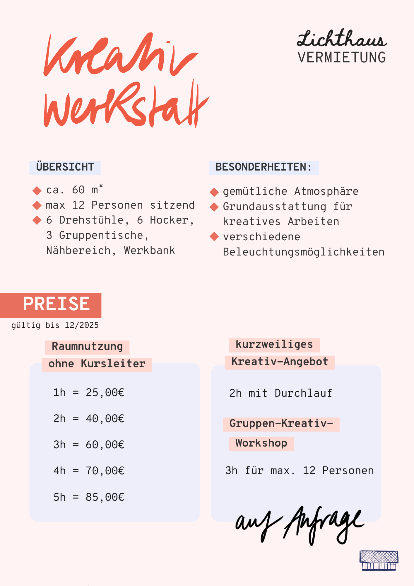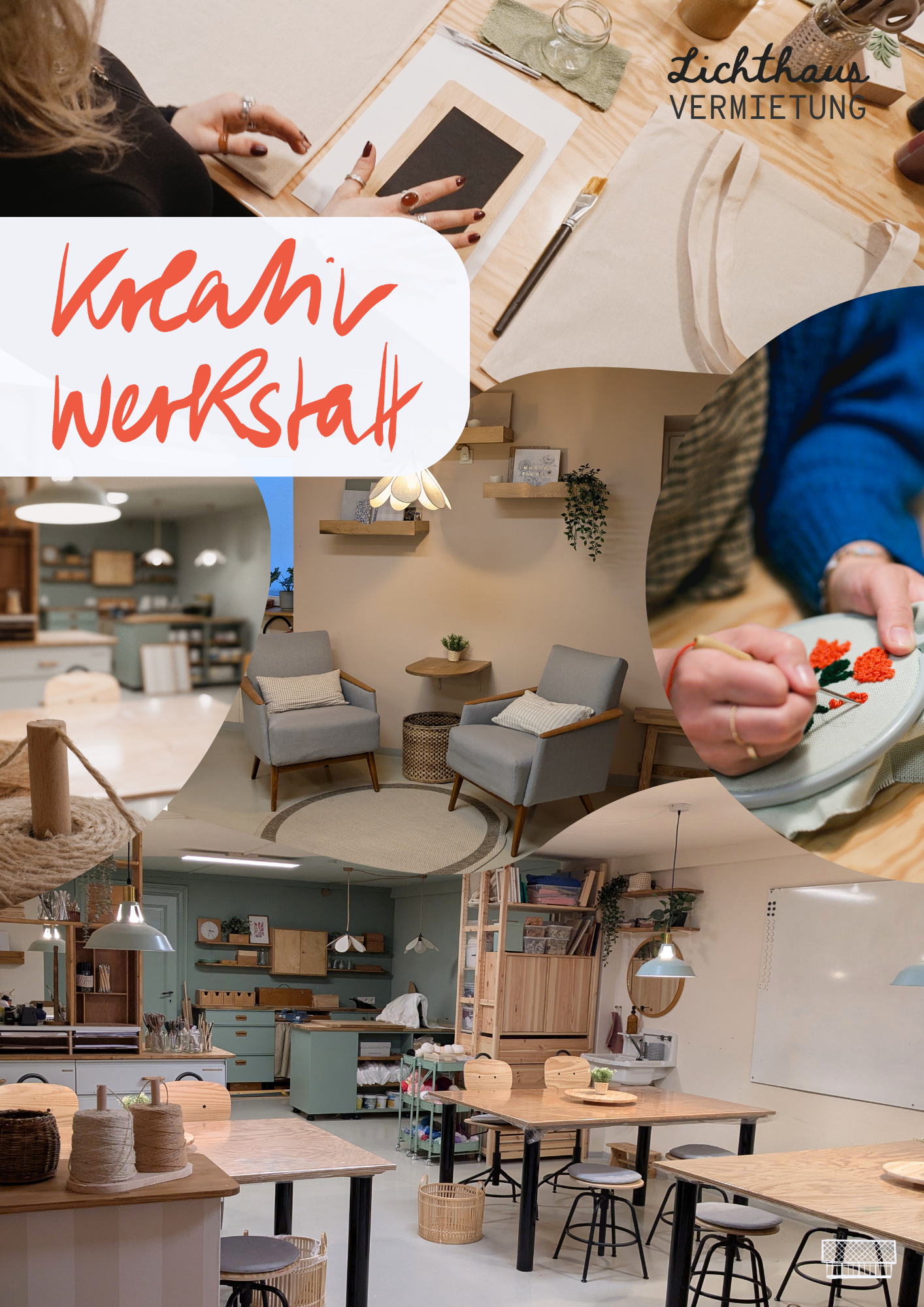 Du hast ein kreatives Event im Sinn oder möchtet einen Kreativkurs anbieten? Unsere Kreativwerkstatt bietet Platz für ca. 10 Personen und läd zum inspirierten, konzentrierten Handwerkern und Arbeiten ein. Weitere Details erfährst du hier.
